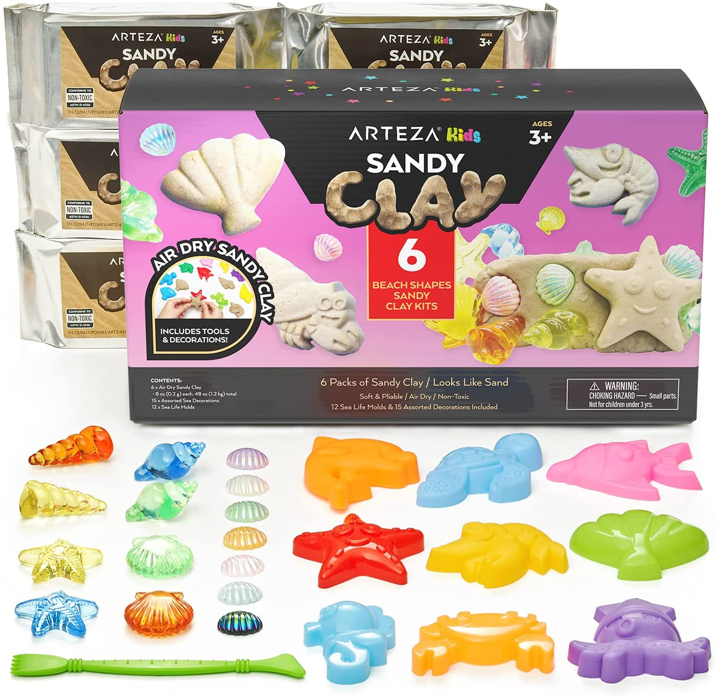 Arteza Kids Sandy Clay is the perfect kit for kids who want to create their own sandy beach experience. The kit comes with 6 packs of sandy clay, 12 sea-life sand molds, and 15 assorted decoration seashells. With this kit, children can use their imagination to create their own sandy masterpieces using the decorations and sea-life molds. The kit is also useful in helping children develop motor skills.